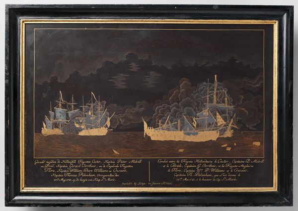 Editor: Here we have "The Battle of Dogger Bank," a watercolor created in 1782. The composition strikes me as very ordered, almost diagrammatic. What historical or social context informs how we might interpret such a symmetrical depiction of naval conflict? Curator: The formal arrangement invites a consideration of power dynamics and national identity during that era. Think about it – naval battles weren't just about military strategy, but also about asserting dominance on the global stage. The near mirror image presentation suggests an attempt to demonstrate the strength of both sides of this particular conflict, Dutch and English. Editor: That’s interesting. So the symmetry isn't necessarily about accurately representing the chaos of battle? Curator: Precisely. Consider the colonial undertones, the fight for resources, the power struggles inherent in these large ships battling for control. The artists wasn't merely recording the event, but was constructing a narrative that shaped how people perceived the relationship between nations. Does the rigid order perhaps mask underlying inequalities and tensions? Editor: I see what you mean. It's like the painting is presenting a facade of order on top of a much more complicated reality of imperial ambition. Curator: Exactly. Think about whose voices are amplified in historical depictions of war, and whose are silenced. Who benefits from this perceived balance of power? This kind of painting served a function – a visual piece of propaganda and mythmaking. Editor: That adds so many layers to my understanding! I hadn't considered how the painting itself could be a political statement, consciously or unconsciously. Curator: Exploring these deeper contexts really changes our understanding. We go beyond the surface and start to question what the artist is really communicating about that time and the powers at play. Editor: Definitely. I'll never look at a historical painting the same way again.