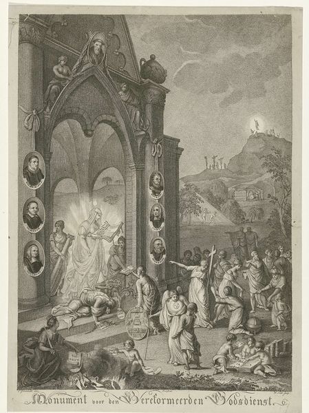 Curator: This image, by Eugen Neureuther, depicts Maximilian bestowing a coat-of-arms upon Albrecht Dürer. Editor: It feels like stepping into a grand, chaotic dream, doesn’t it? A swirl of figures, almost overwhelming. Curator: Indeed. It's an engraving, and we see the representation of power dynamics—the emperor’s recognition solidifying Dürer’s place in society and art history. Editor: I can almost smell the parchment and ink! There's something about the sheer density of the scene that speaks to the weight of legacy, the burden and honor of artistic recognition. Curator: It's a powerful statement about the intersection of imperial patronage and artistic genius, the ways in which artists throughout history have negotiated power. Editor: It leaves me thinking about what it means to be "recognized" – and who gets to decide such things. Curator: Precisely, and thinking about the power structures that shape such recognition is important. Editor: Definitely a piece that lingers, and makes you wonder about the whole recognition game.