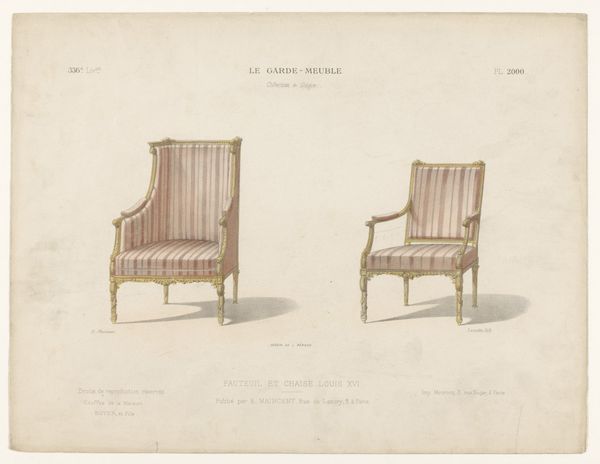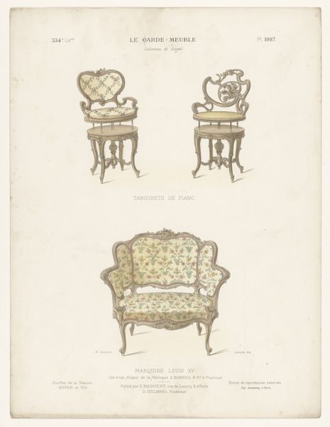Curator: Oh, those look impossibly cozy, like something your grandmother might have had. All they're missing is a doily. Editor: This is "Designs for Four Upholstered Chairs," a pencil and print drawing dating from 1841 to 1884 by Charles Hindley and Sons, currently held in the Metropolitan Museum of Art. They evoke a certain period, don't they? Curator: Absolutely! I see a lot of Victorian England, afternoon tea, and a touch of… constraint, maybe? All those tufted buttons, they’re both inviting and ever so slightly buttoned-up. Do you get a sense of that too? Editor: The symmetry and almost technical quality of the draftsmanship, in tandem with the gentle curves, present a duality I find quite compelling. There is a sense of burgeoning industrial innovation combined with lingering aristocratic tastes. The decorative floral patterns covering each chair denote a yearning for nature as urban life accelerated. Curator: Right. They wanted to be grounded. Thinking about how people interact with objects like these...the chairs almost become little stages for the self. The slight differences in design—the higher back on one, the more compact shape of another—hints at diverse personalities they could accommodate, right? Or at least, *pretend* to. Editor: I see how you arrive at the notion of performativity. The scale feels very human. Each design conveys something unique: stability, comfort, authority. It's a quiet, powerful language. They were masters in subtly expressing their customers desires, which in return, helped their customers to see themselves. Curator: I agree; the detail suggests great empathy for how things feel, how textures register with our senses and memories. They tap into something really universal about what "home" is meant to be. But can you just imagine how itchy those things were? Editor: Ha! An unromantic, but valid point. So, the chair. What starts as comfort might easily evolve into symbolic enclosure. This design really triggers thoughts of comfort. What feelings do the design trigger for you? Curator: You know, studying designs like these, rendered so meticulously in pencil and print, feels a bit like peering into a collective memory bank, reminding us how closely tied our aesthetic tastes are with who we envision ourselves to be. Thanks for guiding me today, it's always helpful getting another perspective on artwork! Editor: My pleasure! And thanks for joining me—examining this domestic scenery through such divergent yet converging lenses truly brought to life a seemingly commonplace object.