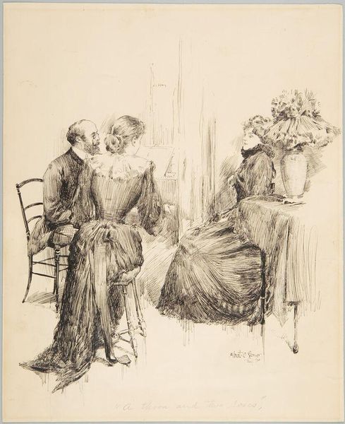 Jean-Louis Forain created this drawing, “Conversation,” using pen, ink, and wash. The composition immediately draws us into a scene of social interaction, defined by sharp lines and tonal contrasts. The artist uses a limited palette, focusing on the interplay between light and shadow to create depth and mood. Forain masterfully employs line to delineate the forms of his figures. Note how the bold strokes of ink define the contours of the woman’s dress and the men’s attire, while the wash technique softens the background and adds a sense of atmosphere. There is a tension created between the detailed rendering of the foreground figures and the more suggestive treatment of the background. This tension reflects Forain’s engagement with contemporary social dynamics. The stark contrasts and compressed space serve to heighten the sense of psychological complexity inherent in social interactions. This work destabilizes conventional notions of social harmony, suggesting that underneath polite conversation, complex power dynamics are at play. The artist invites us to consider how appearances can both reveal and conceal underlying truths.