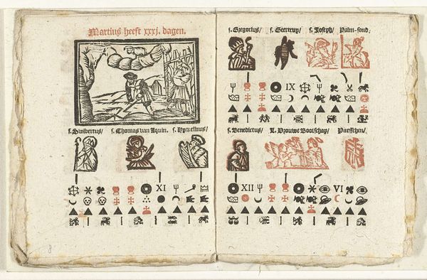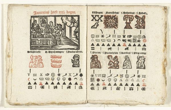 Curator: This double-page woodcut print, "Bladzijden met de voorspelling voor de maand februari, 1712," presents a fascinating glimpse into early 18th-century almanacs. Look closely, and you'll see how information and illustration are intricately combined. Editor: My first impression? This feels incredibly cryptic! It has a stark, almost unsettling quality, like a page from a medieval grimoire. The figures and symbols create a sense of coded knowledge. Curator: Precisely! Consider the materials: woodcut is a labour-intensive process, reflecting the time and skill invested in creating each impression. The act of repetitive printing suggests a wider consumption by literate but possibly not wealthy demographics. This isn't elite art; it's designed for everyday use. Editor: Yet, within that “everyday” context lies a dense web of social and cultural anxieties. Look at the main scene. The domestic interior, that looming figure lurking by the door—it's rife with narratives around gendered labour and class relations. Are we witnessing surveillance, an interruption? How did the emerging bourgeoise internalize such moral codes? Curator: We need to factor in the use of astrological and calendrical symbology that would be of utmost practical use for farmers. The print makes labor both in the form of the woodcutter and the peasant accessible in these images. Editor: Definitely, and notice how saint's days are noted alongside these symbolic markings. These figures may seem divorced from our modern lives but the power and the ritual significance placed on them highlights the deep interconnectedness that links pre-modern subjects. They sought clarity in the movement of heavenly bodies because earthly existence could be unstable for those dispossessed in myriad ways, no less today than yesterday. Curator: Seeing these kinds of printed graphics highlights how images play in daily functions for those beyond the economic class with portraits hanging on their wall or statues in the house. The symbolism embedded in this format allows a more material investigation. Editor: Absolutely. What might seem like simple illustration provides this fascinating doorway for asking difficult and ongoing questions, questions of agency, exploitation, and enduring social tensions. Curator: Agreed, examining it from the perspective of craft and labour adds dimension to our understanding of both the art and the era from which it emerged. Editor: Exactly. These supposedly archaic forms invite continuous interrogation, always reframing how we look, and most crucially, why we look, now.