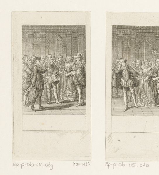 Curator: The artwork we're looking at is Daniel Nikolaus Chodowiecki's "Hoogmoedig huwelijk," or "Proud Marriage," an engraving dating from 1788 and residing here at the Rijksmuseum. What are your first impressions? Editor: Initially, it feels… constrained. The line work is precise, almost sterile, offering little in the way of visual texture, but creates forms with neoclassical poise and rigidity. This, and the small scale give the work an air of almost academic exercise. Curator: That perceived restraint speaks volumes. Notice the linear precision typical of engravings—how each line meticulously contributes to the overall composition. The use of line dictates the contrasts and tonal gradients in a strictly controlled manner, evoking a particular visual cadence typical of baroque modes and themes. Editor: Yes, and consider what that precise rendering suggests about the production itself. This print was made via a highly specialized set of skills with burins, metal plates, acids, presses. Each pulled print reflects the labour required in both its creation and circulation. It’s also clearly narrative, indicating mass consumption rather than singular contemplation. Curator: Precisely. The narrative unfolds across a series of vignettes; it begs a linguistic unpacking. One can consider how narrative structure relies on repetition, opposition, and resolution, as if this visual schema is trying to approximate the experience of reading itself. The eye jumps panel by panel. Editor: And that narrative hints at the social reality embedded in these arranged unions. The man's exaggerated reaction within the interiors reads as a reaction to a commercial exchange taking place outside, underscoring a loveless societal mechanism. Curator: Absolutely. The interplay between image and societal critique demonstrates Chodowiecki's awareness of the conventions—and cracks—within societal performance. It serves as a potent commentary. Editor: Agreed. And I find the means of distribution particularly poignant here. Through reproducible engravings, such critical perspectives found broader reach, circulating commentary far beyond elite circles to influence popular perspectives and even behaviours. A craft used to circulate powerful and influential messages that resonate far beyond formal constraint and aristocratic aesthetics. Curator: A fascinating dance of form and content. Chodowiecki offers much to unravel, revealing the visual language and encoded social commentary that shapes our perception of past conventions. Editor: Indeed. Seeing how material choices directly enabled this discourse sheds valuable light on cultural agency.