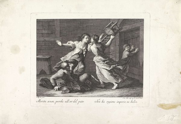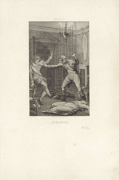 Editor: This print, "Tweegevecht met de degen," or "Duel with rapiers," by Reinier Vinkeles, dates back to 1798. There's such high drama captured in this Baroque interior; it feels like a theatrical production! What do you make of this intense scene? Curator: Immediately, I am drawn to the recurring symbol of conflict itself. The rapier, beyond its literal function as a weapon, represents a clash of ideals, honour, or even social status. Dueling was a highly codified ritual, a performance as much as a fight. The positioning of the figures – one standing victorious over the fallen – evokes the fleeting nature of triumph and the ever-present possibility of defeat. How might societal norms contribute to acts of aggression or passion, especially considering what appears to be witnesses to this conflict? Editor: That's a great point! The witnesses peeking through the doorway certainly suggest this is playing out for an audience, doesn't it? Perhaps honour, but performance is certainly present here. Curator: Exactly! Note also the use of light and shadow – the dramatic chiaroscuro. It's no accident that the victor is more brightly illuminated, reinforcing their dominance within the narrative. Consider how this plays on our own perceptions of power and vulnerability when such visual languages are continuously being communicated. What aspects might speak to our contemporary obsession with spectacle, despite centuries of social change? Editor: It is hard not to interpret this beyond the honor code – a staged event for viewers. Curator: Indeed. I find it revealing to observe these echoes through time. Perhaps Vinkeles is reflecting a more broadly recognized performance of self within strict social constraints that resonate into contemporary society as well. Editor: That offers a fresh viewpoint. Now, thinking of it as a study of character gives it so much depth. Curator: And visual literacy enables us to connect these threads throughout history.