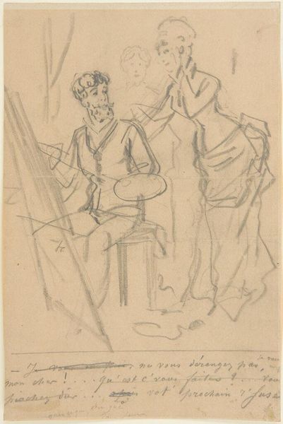 Curator: This delicate pencil drawing, titled "Wandelend paar," or "Walking Couple," comes to us from the mid-19th century and the hand of Charles Rochussen, residing here at the Rijksmuseum. What’s your first impression? Editor: My first thought is its ephemerality; it's almost ghost-like. The figures seem caught between being and un-being, perhaps hinting at transient social interactions. Curator: Rochussen's choice of pencil and the sketch-like quality certainly lend itself to that impression. Pencil as a medium speaks volumes about accessibility and function; here it hints towards idea generation in sketchbook art for narrative or genre-painting. We can examine the labor and availability that facilitated such sketches. Editor: Yes, but consider how these quick lines emphasize form above all else! See how a few strokes define the volume of the skirt, the fall of the jacket. It captures essence without committing to detail. The lines create structural outlines which contain visual interest to our eye, guiding it. Curator: Intriguing point. One could extend that thought into the social conditions where quick sketches were a mode of documentation or perhaps, initial character developments for later paintings meant for a market audience. Romanticism often sought accessibility—were these works intended as stepping stones for consumption? Editor: Consumption isn't the first thing that comes to mind, though the social standing is obviously suggested in their fashion; the dress of the lady, the gentleman's attire and posture, the subtle Romantic brushstrokes evoke certain sentimentality within its figuration! It communicates elegance without overt luxury—making it accessible formally, if not socially. Curator: Agreed! Its inherent ambivalence captures an atmosphere poised between aspiration and achievement during this epoch. Thinking further on material consumption – Rochussen later developed into a full-blown lithographer and illustrator, which, using a completely different approach of artmaking, eventually gave the artist, wealth. It's clear that material value plays a large role within this particular stage and place! Editor: It really demonstrates how the medium informs perception. This sketch invites more of an intellectual pursuit where we follow Rochussen in the creative stages of capturing that spark. Thank you for drawing out all these fascinating layers.