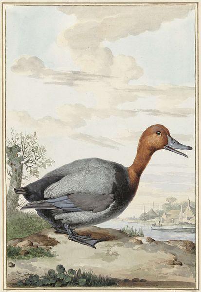 Editor: This is "Carolina eend", a watercolor by Gerrit van den Heuvel, dating back to 1771. I’m struck by the stillness of the water, almost mirroring the duck’s serenity. It's quite detailed for a watercolor; what initially captures your attention? Curator: Well, darling, it’s that peculiar mix of scientific observation and dreamy atmosphere that really tickles my fancy. Look how meticulously each feather is rendered, almost as if van den Heuvel were creating an avian portrait for Linnaeus himself! But then, those hazy washes of the background—sky and water—suggest something far more romantic. Don't you think it's a rather curious combination of cool scientific pursuit and warm artistic feeling? Editor: It is a strange contrast. It’s like he's documenting and dreaming at the same time. The level of realism given to the bird feels out of sync with its dream-like environment. Was that common in 18th century art? Curator: My sweet thing, in the 18th century, the world was being cataloged! This was the Age of Enlightenment; exploring new continents, discovering new species. Artists often blurred the line between science and art – beautiful depictions served a genuine purpose. I wouldn't be surprised if this was painted for a nobleman's private study; a pretty picture that doubled as an illustrated page from a nature encyclopedia! Editor: That makes perfect sense. So it's more than just a pretty bird! Curator: Exactly! The eye can see the truth through beauty. Isn't that marvelous? What began as a study in watercolor might, for Gerrit van den Heuvel, turn into something of profound historical significance.