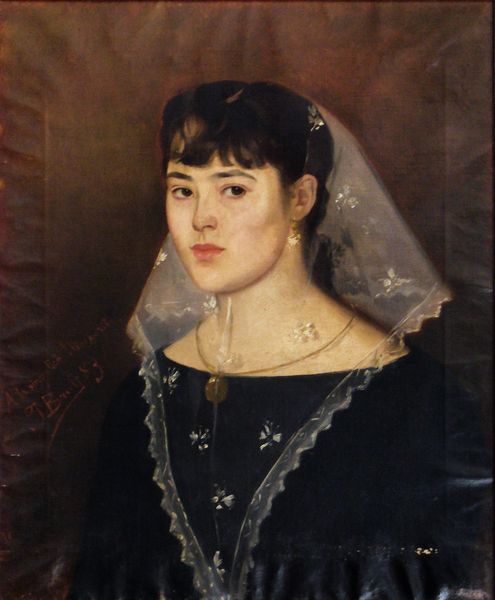 Curator: Looking at this captivating oil painting, titled "Maria Hahn" by Raimundo de Madrazo, I’m immediately struck by a sense of restrained emotion. The woman's gaze is so direct. Editor: I agree; the pose exudes confidence, yet there’s a melancholy in her eyes, as if weighed down by some untold story. The dark palette contributes to that somber mood, contrasted only by those vivid flashes of red in the flowers and the ribbon. Curator: Exactly. Considering its genre within 19th century portraiture, particularly the burgeoning intimism, this portrayal subtly challenges typical gender roles of the period. Maria isn't just an object to be admired, she is asserting her individual presence, even hinting at a life lived outside the canvas. Editor: The lace shawl seems particularly laden with significance. It both conceals and reveals, framing her face while suggesting a certain opulence. It reminds me of similar adornments depicted across cultures and centuries, often signifying status or even mourning, adding a symbolic weight. And look, isn't she holding some kind of pendant? Curator: It appears so, dangling delicately from her gloved hand, an understated signal about the artist's technical prowess, of course, but also of this woman's position and private affairs. It might serve as a cipher for hidden longings or perhaps societal restraints that existed for women in those times. Madrazo definitely wants to evoke thought and contemplation regarding class and identity. Editor: The layering is definitely impactful—from the ruffled lace to the pearl necklace and dark gown. There's a sense of depth created not only by technique, but by the intricate interplay of meanings projected via those material details. Curator: It all certainly allows for multiple interpretations through a contemporary lens. Madrazo gives the viewer space to consider Maria Hahn not merely as an anonymous portrait, but as a unique person. Editor: A resonant consideration about how material things both signify status, but also create individual presence.