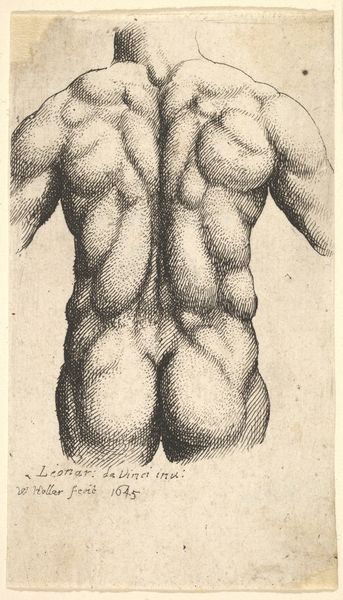 This is Wenceslaus Hollar’s “Male torso from neck to hip in profile to left”, an engraving dating from 1645. The tight cropping and stark presentation of the male torso draw our immediate attention to the play of light and shadow, meticulously rendered through dense, cross-hatched lines. The artist has structured the composition to emphasize the body's musculature and the texture of the skin. The torso's form is built up through a network of fine lines, creating an almost tactile experience. The varying density of these lines produces an interplay of light and shadow, giving depth and volume to the figure. Hollar, a master of printmaking, here explores the possibilities of line and form, pushing the boundaries of representation within the medium. This engraving serves not only as a study of the male form but also as a testament to the power of lines to define and articulate the human figure. It invites us to consider how simple lines can create complex representations and evoke a powerful sense of presence and physicality.