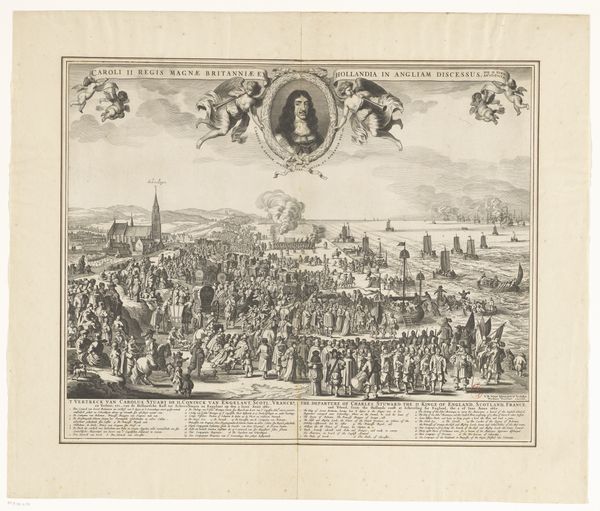 Curator: Here we have an engraving titled "Gezicht op Londen," dating from after 1711, by an anonymous artist. The detail is fascinating! Editor: Yes, the sheer density of lines creating the buildings and the sky gives the entire print a very textured feel. What aspects of this composition strike you the most? Curator: The artist's command of line is exceptional. Observe how varying the density and direction of etched lines modulates the tonal values, creating a sense of depth and aerial perspective. The intricate rendering of architectural elements contributes to a dynamic interplay of light and shadow. What structural relationships do you perceive? Editor: I notice the division of space; the top half focuses on the city in the distance, above what looks like the river, and the bottom half features what appears to be individual portraits and a landscape in the foreground, connecting to a decorative cartouche underneath the print, creating this tension between realism and symbolic elements. Curator: Indeed, the contrasting zones create a visual tension, inviting us to explore how form articulates content and meaning. We can view it from the formalism stand-point as an approach that isolates different values. How would you interpret such a construction from the perspective of the artist and their formalistic intention? Editor: Perhaps it highlights a separation between the urban and the personal, showcasing the importance of the individuals as patrons of London. Curator: That's a sound observation. The work offers fertile ground for analyses based on form and structure. Editor: I’ve definitely learned to think more about the intentionality behind seemingly simple choices like line weight and composition. Curator: As have I; the dialogue highlights our subjective and interpretive relationship to forms.