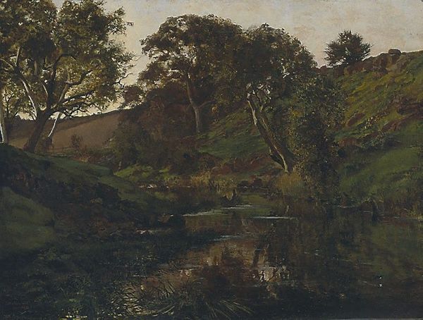 Editor: We’re looking at “Cranes watering at the edge of a pond” painted by Charles-François Daubigny in 1873. It appears to be an oil painting, and honestly, it feels a little melancholic to me. A sort of hazy stillness. What stands out to you in this piece? Curator: Ah, Daubigny! He could capture a mood like no other. I'm drawn to the quiet intimacy. It’s more than just a landscape; it's a feeling. Look at how the water reflects the sky – it blurs the line between earth and heavens, right? Editor: I do! It's almost like the sky is breathing into the pond. Is there a reason Daubigny chose cranes specifically? Curator: Cranes often symbolize longevity and peace, but knowing Daubigny, I reckon it's less about strict symbolism and more about what moved him. He painted en plein air, immersing himself in nature. Maybe it was just the graceful dance of those birds that day. He wasn't trying to preach, just to share what he saw and *felt*. Did he capture that feeling for you? Editor: Definitely. It makes me want to grab a brush and try to bottle my own moods! But painting is so intimidating! Curator: Oh, it IS. It is all just smearing feelings onto canvas! He struggled to convey it as we all do! It’s the honesty that touches us I believe. Editor: I think I'll look at landscapes a bit differently now, searching for the feeling, not just the scenery. Curator: Exactly! Art is less about *seeing* and more about *feeling*. Daubigny reminds us to trust our own senses.