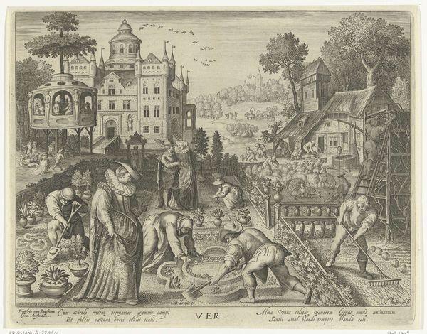 Curator: Immediately, there's a real sense of organized chaos here. So much activity crammed into one space. Editor: Indeed. This print, "Jubal en zijn gezin maken muziekinstrumenten" or Jubal and his family making musical instruments, dates to 1583. It's the work of Johann Sadeler I and resides here at the Rijksmuseum. It showcases a landscape brimming with people making instruments in the foreground and dancing figures farther away. Curator: The details surrounding instrument-making really captivate me, offering a rare glimpse into early workshops and family life. The family angle is also fascinating. Editor: Definitely. Jubal, a biblical figure, is considered the father of all who play stringed instruments and organs. In that context, this engraving is loaded with symbolic intent, beyond the day-to-day. Music has always possessed transformative power. Notice how those being entertained react—seemingly lifted into a divine madness. Curator: It’s fascinating how art like this both reflected and reinforced societal hierarchies, especially the value of creative professions. Yet, how did this imagery influence artistic culture during the northern Renaissance, specifically regarding genre painting and the portrayal of daily routines? Editor: The musical instruments serve as powerful visual emblems. They denote culture, leisure, sophistication. They're visual triggers that elevate the subject from simple genre painting into something more profound: an emblem of human creativity blessed by God. Think how often musical instruments feature in vanitas paintings as metaphors for fleeting beauty and earthly pleasure. Curator: So, this is more than a family portrait; it's a proclamation of music's societal and spiritual standing. It presents the Renaissance ideal of mastering arts within an environment of burgeoning global exchange. It served, perhaps, as aspirational and inspirational for audiences who saw societal upliftment via music and art. Editor: Absolutely. Seeing this piece in the broader context of European cultural development helps to deepen an understanding of not only music’s past role, but also where music may lead future society and thought.