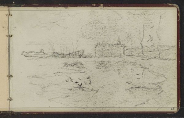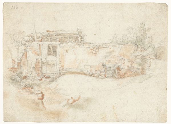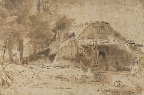 Editor: So, here we have Titian's "Landscape with a Goat," a charcoal drawing dating back to the early 1500s. It feels… incredibly intimate, like a stolen glance into a quiet, rural world. What do you see in it? Curator: That's a beautiful observation. Intimate it is, a whispered secret from a world we think we know. You know, I see a yearning, almost a palpable breath of longing. The buildings are solid, yet the strokes defining them seem hesitant, dreamlike. Notice how the goat, ostensibly the subject, is almost an afterthought, fading into the strokes of the landscape. What does that say about the real focus of the drawing, do you think? Editor: Maybe the goat isn't the subject at all! Maybe it's more about capturing the essence of the landscape itself – the feeling of being in that place, rather than just depicting what’s there. Curator: Precisely! And think about charcoal itself. It's such a raw, elemental material, literally burnt wood. Titian's using this primal stuff to evoke a scene that’s both familiar and ethereal. I wonder, did he stumble upon this scene? Did it spark an inner vision? It feels more like a memory being conjured. Editor: That makes sense. There's a sense of something fleeting, like the moment will disappear if you blink. Curator: Exactly! Almost like Titian captured something sacred in the ordinary. This isn't just a landscape; it's a feeling made visible. Editor: Wow, I’ll definitely never look at a landscape drawing the same way again! I appreciate your insights. Curator: My pleasure, it is inspiring to see these old works through fresh eyes. Art is never really finished, is it? It keeps evolving with each observer.