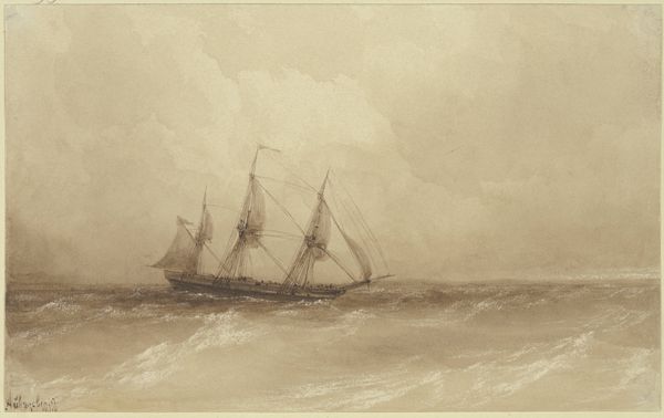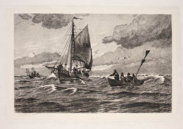 Curator: Anton Melbye's "Fishing Boat at Sea," created in 1866 and currently housed at the Metropolitan Museum of Art. It's executed using watercolor, drawing, and print techniques. Quite evocative, wouldn't you say? Editor: It feels like staring into a particularly turbulent memory, or maybe a bad dream. The somber palette is just masterful, casting an overwhelming feeling of struggle and maybe… resignation? Curator: Absolutely. The artist clearly prioritizes capturing the raw, elemental struggle inherent in maritime labor. Note how the mark-making, particularly in the waves, conveys immense force. And, of course, the social realities faced by those working on these vessels at the time. Editor: It’s bleakly gorgeous, though! I imagine the salt spray on my face, the sting of the wind… it's unsettling, but compelling. Almost as though the boat is fighting with the ocean and there isn’t an obvious victor yet, it has you consider who would be in reality. The layers and use of the grey-based scale. Curator: I'm intrigued by your personal engagement with it, given that it seems deeply concerned with the means of production in marine industries. Notice the visible lines denoting the boats craftsmanship juxtaposed against the fluid washes indicating weather’s unpredictability? This highlights material engagement. Editor: But see, I think that tension is exactly why it works! It’s not just a rendering of a boat; it's a feeling made visible. You can smell the brine, imagine the wood creaking under the onslaught of waves. And how much of that feeling depends on those layers, each a record of labor and craft that speak directly to the emotions evoked? It’s not romanticized but there is romance. Curator: Fair point! It reveals layers that echo throughout the maritime industries back then; where the act of production of sailing and fishing isn't isolated but connected, materially interwoven with so many social concerns. A harsh lesson, visualized. Editor: Exactly! It resonates with a truth about vulnerability, the dance between humanity, our ambitions, and indifferent, uncaring, beautifully rendered nature! I feel like I will keep going on that point, what a beautiful painting. Curator: Agreed. It's certainly a potent piece. It really makes one ponder on labor's place amidst romantic visions. Thanks! Editor: Thanks to you! A stormy sea indeed, full of both turmoil and quiet understanding!