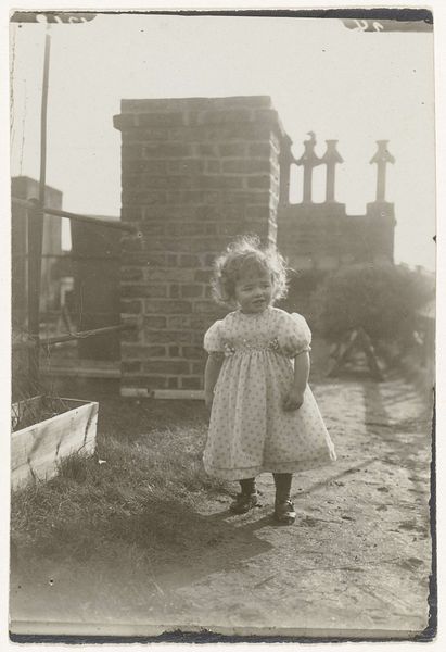 Editor: This is Robert Frank’s "Girl and horse in field, Paris," taken in 1951, a black and white print photograph. The photo seems to convey a sense of melancholy or perhaps quiet resilience. What do you see in this piece through a formalist lens? Curator: Immediately, my focus is drawn to the stark compositional elements: the distinct separation of foreground and background, defined by varying levels of contrast and detail. Observe how the girl’s form provides a strong vertical thrust that is slightly off center, against the more subdued horizontal of the horse. Editor: I do notice that. The buildings in the distance add another horizontal element, grounding the composition, almost like a stage backdrop. Curator: Precisely. Note, too, the textural variations. The soft blur of the background contrasts sharply with the grain and relative detail apparent in the girl’s clothing and expression. The tonal range in the gray scale itself creates a mood and guides the eye. What feeling is generated from this limited range of tones? Editor: A sense of quiet introspection, perhaps? It’s very subtle, the gradations of gray make the light itself almost a subject. Curator: The interplay between light and shadow enhances the volumetric form, don’t you think? And see how the flatness and compression of space created by the photographic medium are utilized. The contrast between these things—the form, flatness, light and dark—suggest a calculated visual strategy, moving beyond a mere document. Editor: I see it now. Focusing on the composition and form draws out so much more than just the subject. Curator: Formal analysis enables that very shift in focus. It encourages you to appreciate not only what is depicted, but how it's depicted through light, texture, tone and composition.