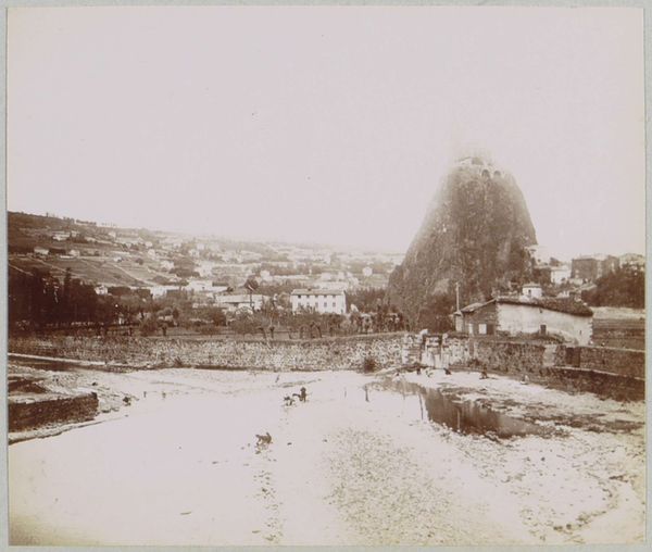 Curator: Here we have “Bandenwissel van automobiel op een weg bij Rocamadour,” a photographic print captured in 1903. Delizy is the artist behind it. It's part of the Rijksmuseum collection. Editor: Oh, what a captivatingly mundane scene. There’s something incredibly still and human about it, like pausing time itself. All that brown hues and textures evoke a profound sense of nostalgia and history, with just a tinge of humor about the breakdown itself. Curator: Right? It’s funny, isn't it, that something as commonplace as changing a tire has become a window into the past? I am very interested in the symbolism here: that stranded car might evoke a metaphor for the halting of progress. Notice how tiny Rocamadour is against the vast sky. Is the old world looming over the new, creating a certain anxiety? Editor: Or maybe they're simply showing the marriage of old and new; it can be read in two directions, right? The men are resolutely fixing it, becoming part of the landscape. It seems that the modern machine becomes another ancient building clinging to that cliffside. Curator: That's an interesting reading. Look closely at how Delizy positions the subjects. Their attire suggests a particular class, possibly leisurely tourists, making this roadside stop almost performative. Editor: I think so, too. But even more striking is how the landscape dominates. Even with their newfangled automobile, the men are still subordinate to the timeless power of nature. It all has a circular, eternal quality. Curator: And the road itself – the setting of the scene is, quite literally, at a crossroads. Maybe it symbolizes our uncertain trajectory at the beginning of the century. I can certainly feel its psychological effect—the anxiety surrounding the advent of machine in landscape. Editor: Absolutely. Delizy has immortalized not just a flat tire, but that pivotal moment when human ingenuity confronts both its potential and its limitations against nature. The road, the ancient village...it's all woven together. It is as though photography can freeze time, making visible all its invisible and unexpected connections. Curator: True. I now think of it less about technological anxiety and more like Delizy finding grace even in the pause.