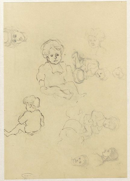 Editor: So, this is Degas’ "Four Studies of a Baby's Head," from around 1864 to 1867. It’s a pencil drawing. I'm struck by the softness of it, like capturing a fleeting moment of childhood innocence. What can you tell me about it? Curator: This drawing offers a window into Degas' artistic process, but also reflects 19th-century society’s increasing focus on childhood as a distinct and important stage of life. These types of sketches were preparatory works, explorations of form and expression, but how did the focus and proliferation of family-based imagery in the popular press influence Degas? Editor: So, the baby’s portrait wasn’t just a study of form, it was also, in a way, a study of what people wanted to see? How does that relate to the impressionistic style he’s using here? Curator: Precisely! The Impressionists were interested in capturing modern life. Think about it, widespread photography started changing the way people viewed art, right? Painting no longer needed to just be representational. Did new technologies impact how he depicted his subject? Editor: Oh, like he’s trying to capture something a photograph can’t, that quick sketch quality, focusing on light and emotion over precise detail. Curator: Exactly. Degas was capturing a feeling. But beyond that, the repeated studies also imply something about the artist's access and social circles. Whose child was he drawing? Was this a paid commission or a familial favor? These factors also influence how the drawing was perceived and valued. Editor: It’s fascinating how much the social and political context shaped what appears to be just a simple baby sketch. I'll definitely be looking at Impressionist art differently now! Curator: Indeed. It's not just the art *in* the frame, but the world *around* it that shapes our understanding.