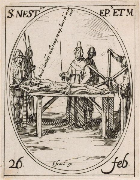 Editor: Here we have Jacques Callot's small print, "Saint Pelagius." It’s a rather grim scene, but the fine lines give it an almost delicate feel. What do you make of the composition? Curator: Delicate, yes, but look closer. Callot's known for his sharp observations, even cruelty. See how the "martyrdom" takes center stage? It’s not just a religious scene; it's a spectacle, deliberately presented with a certain... detachment. What does that detachment evoke in you? Editor: That's interesting. I see the figures more as actors in a play, rather than participants in a gruesome event. Curator: Exactly! And that tension between the horror of the subject and the theatrical presentation is where Callot’s genius truly lies. What a thought, huh?