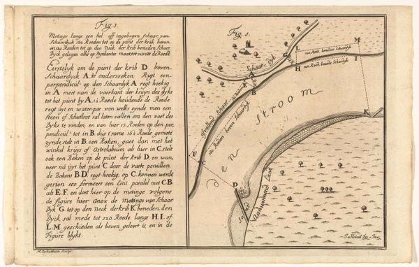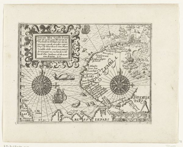 Editor: So, here we have an engraving, “Kaart van de kust bij Callao,” or “Map of the coast near Callao,” created anonymously between 1644 and 1646. It depicts the coastline of Peru. What strikes me is the way the ships are clustered together, almost defensively. What do you see in this piece? Curator: I see a potent emblem of Dutch ambition cast onto a newly perceived world. The map itself isn’t simply geographical; it’s a symbolic claim, a bold assertion of presence in a space already inhabited, already understood by its indigenous peoples. The compass rose at its heart pulses with intention. Editor: Intention? Like… colonial ambition? Curator: Precisely. But also consider the ships themselves. Ships often represent journeys, exploration, and trade – powerful drivers of the Dutch Golden Age. Their clustering implies perhaps vulnerability, but equally, strength in numbers. They're icons of a specific moment in history, carrying weighty cargo – not just goods, but ideas about civilization, power, and religion. Editor: So, every element, the coastline, the ships, the compass, become like a word in a visual language of that era. I hadn’t thought about a map being read in that way before. Curator: Maps are rarely neutral. They often reflect the values and worldview of the people who created them. By dissecting the imagery and symbols embedded, we unravel the narrative those people wished to communicate. Editor: I think I see what you mean. This isn't just a map, it is propaganda! Curator: Exactly!
