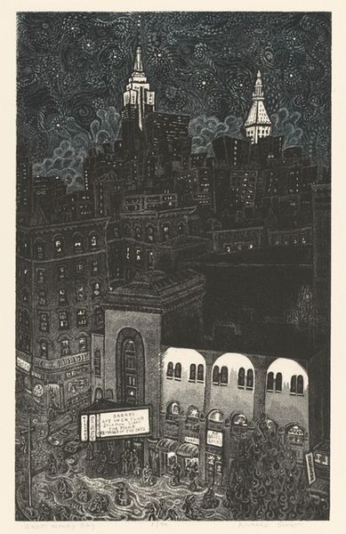 Antonio Frasconi's woodcut print presents us with a stark yet captivating view of The Fulton Fish Market. The architectural structure dominates the composition, rendered in contrasting blocks of black ink against the white of the paper. The eye is drawn upward along the vertical axis, encountering the intricate brickwork and rhythmic repetition of windows. Frasconi masterfully uses the medium of woodcut to emphasize the structural elements of the market. The sharp lines and planar surfaces create a sense of depth and solidity, while the textured grain of the wood adds a tactile quality. Beneath the looming building, the bustling market scene unfolds, capturing the dynamic energy of human activity. This juxtaposition sets up a compelling visual narrative. Ultimately, Frasconi's work is a study in contrasts. The formal elements come together to create a layered narrative about urban space, labor, and the enduring spirit of human enterprise.