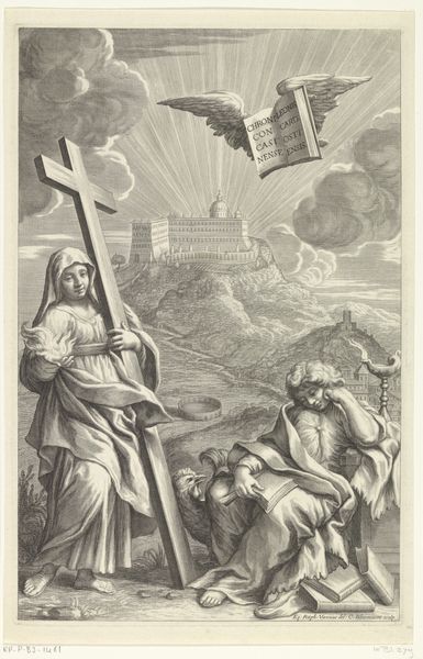 Editor: Here we have Willem Basse's engraving "Manoach's Offer," made sometime between 1633 and 1672. There's such drama in this small print! An angel is emerging from the altar fire as Manoach and his wife watch in awe. It’s a really dynamic composition, but also quite detailed considering it's an engraving. What jumps out at you when you look at this piece? Curator: You know, it feels like a window into another world, doesn't it? That smoky, ethereal angel rising… it reminds me of stories my grandmother used to tell. Beyond the narrative, the hatching technique is incredible, really giving depth and form to what otherwise could be flat. I wonder, what does this scene evoke in *you*? Does it feel like a divine encounter, or something more human and psychological? Editor: I think it's both. The angel is otherworldly, but Manoach and his wife's reactions make it relatable. The wonder and maybe a bit of fear in their expressions makes it feel very human. The story, and the technique, feels very Baroque. All the energy packed in here. Curator: Absolutely Baroque! A feast for the eyes and the soul! Notice how Basse directs our gaze – from the couple to the ascending angel? The smoke almost acts as a bridge, pulling us into that heavenly realm. Makes you wonder about the nature of belief back then, and maybe even now. Editor: It's interesting how a relatively small print can still evoke such big feelings, big concepts. It feels very intimate despite its grand subject. Curator: Exactly! Size isn’t everything, darling. It’s about capturing that spark, that fleeting moment of revelation. It’s like a visual poem, distilled to its essence. And who doesn't love a good angel story?