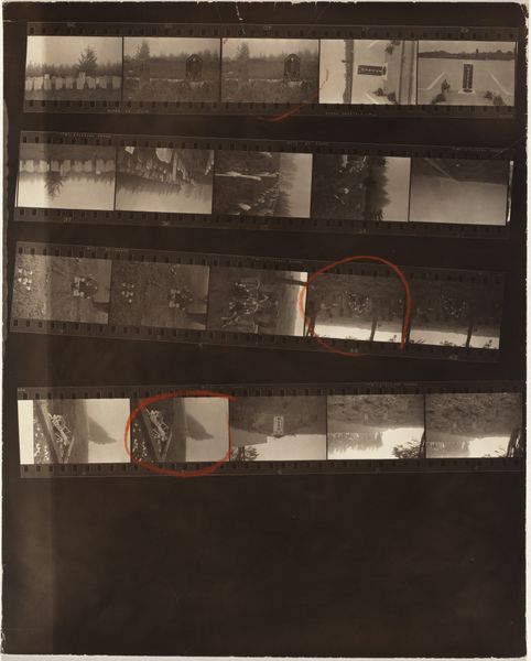 Robert Frank created "From the bus 52/Lines of My Hand 79" using photography. The composition reveals a series of film strips against a black background, each strip containing several frames. Together the repetition of the rectangular frames creates a rhythmic pattern that guides the viewer's eye across the surface. The grainy texture and stark contrast add to the image's raw, documentary feel, typical of Frank's style. The red square, seemingly drawn on the photographic paper, disrupt the linear progression and draws attention to a specific scene, creating a focal point within the broader context of the entire piece. Frank was interested in challenging traditional photographic conventions and documenting overlooked aspects of society, with the use of the film strip format itself emphasizing the passage of time and the sequential nature of experience. The photograph invites reflection on the relationship between individual moments and larger narratives, questioning the way in which meaning is constructed through selection, framing, and juxtaposition.