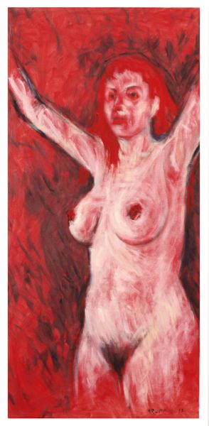 Curator: Let's discuss "Throughout the Neighbourhood" by Tia Peltz, a piece that, though undated, offers a potent look at form and identity. Editor: Wow, it’s striking! The immediacy of it really hits you, doesn't it? Almost feels like a charcoal sketch blown up and splashed with hot sauce. I love the confident messiness. Curator: I agree. The Neo-Expressionist influence is undeniable. We see it in the raw application of acrylic paint, the distortion of the figure, and how line and form meet abstraction. Consider how those bold, black strokes define the silhouette against that intensely red background. Editor: That red… it’s so unapologetic, isn’t it? It amplifies the rawness, makes you feel like you’ve stumbled into some late-night jam session where inhibitions are checked at the door. What is it about, do you think? Curator: The figure is presented nude, almost defiantly so. But it’s also clearly a deliberate figuration, which means, rather than focusing on pure eroticism, Peltz uses this form to explore vulnerability and presence, perhaps challenging viewers to confront uncomfortable assumptions about gender, gaze, and power dynamics. Editor: Definitely feels like more than just a nude. It's like she's saying, “Here I am, deal with it.” I keep coming back to the composition, the way she is posing. There’s strength, but also… is it a bit of defiance in there too? Or maybe exhaustion? Curator: Those interpretations resonate. Neo-Expressionism, born from a sense of cultural malaise and a need to reclaim subjectivity, embraced art that was overtly emotional. So Peltz, working within this lineage, could be reflecting a shared societal fatigue or an active resistance. It invites conversation on visibility, particularly for marginalized bodies. Editor: So true. The energy… it doesn't just sit there, does it? It wriggles under your skin. I bet hanging it in a room changes everything. You'd have to pay attention. Curator: Precisely. It doesn't allow for passive consumption. The artwork serves as a reminder of the dialogues we must have. Editor: Absolutely. It leaves you questioning, which is, let’s be honest, what good art is supposed to do. Tia Peltz sparks fire here, that’s for sure.