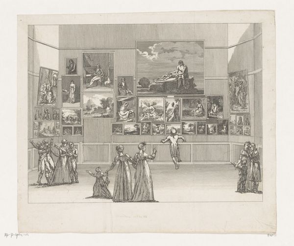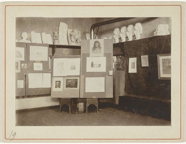 Curator: My first impression is one of organized chaos—a dizzying amount of paintings all crammed together! Editor: Indeed. What we’re seeing here is an albumen print by André-Adolphe-Eugène Disdéri, titled “Grand Salon Carré (France)," dating back to 1855. Disdéri captured the Salon Carré at the Louvre, which even then was quite a spectacle of accumulated artistic masterpieces. Curator: The light’s gorgeous, sort of dappled and soft. But, good heavens, how did anyone actually *see* anything properly, stuck way up there on the top row? I wonder if the idea was to just overwhelm viewers into some kind of aesthetic stupor? Editor: In a way, that excess speaks volumes about the historical context, doesn’t it? It embodies 19th-century ideals of grandeur and imperial power, reflected in the Salon Carré’s sheer visual density and selective display. Curator: Well, I see it more as a kind of… creative democracy, perhaps? I mean, the guy clearly loves paintings! He wants everyone to see ALL the paintings. Even if you need binoculars. It's inclusive… in a nutty sort of way. Or, I bet, there's no curatorial focus! Editor: Interesting point. Though I think the curatorial absence creates hierarchies. Those in the “know,” usually from privileged backgrounds, would've felt validated, whereas others were subtly excluded. That abundance might suggest whose culture is valued and, more significantly, *who* determines that value. Curator: Oh, you’re probably right! All I know is that looking at this makes me want to run through an art gallery and rearrange all the paintings—just for kicks, you know? Disrupt the order. Editor: Disruption sounds like progress sometimes! What I find fascinating is how this single photograph captures an entire discourse about art, power, and access, still resonating today. Curator: Right you are. And me? Well, I simply adore those little tiny chairs lined up neatly beneath all those masterpieces! Don’t you just love those tiny chairs?