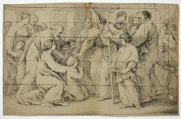 Curator: Palma il Giovane created this dynamic piece, "Christus entweicht vor den Pharisäern," around 1623. It's currently held here at the Städel Museum and primarily executed with ink, chalk and gouache on paper. Editor: My immediate response is one of captured motion. Christ seems to float off the page as this collective surges. There is real tension within this seemingly calm, earthy palette. Curator: Palma certainly understood drama, both visually and thematically. In placing this work within the turbulent atmosphere of the 17th century, we cannot disregard how institutional forces would shape religious artistic production and reception. Editor: Exactly. Let's think about how the figures are rendered, and the historical weight behind their actions. Who holds power and how is that performed? The Pharisees, acting on institutional authority, are depicted with wild gesticulation and appear chaotic while the figure of Christ, moving from them, exudes this sense of peace. Is that his choice or is that simply inherent in depictions of his image? Curator: Interesting! Viewing Christ as choosing or performing that passive representation creates new insight into historical agency. One can also see a deliberate contrast. The architectural setting suggests the confines of religious establishment—which highlights his radical escape and the implications of his movement. Editor: This drawing provides an interesting lens to view contemporary power structures that silence, erase, and threaten individuals. Are we following a single leader, or are we contributing to an artistic lineage? Curator: That’s certainly what’s at stake in interpreting artworks such as this one. There’s such potent history in this drawing and simultaneously it can have radical potential if understood within the contemporary. Editor: A vital reminder that even something created centuries ago can still incite powerful and relevant dialogues.
