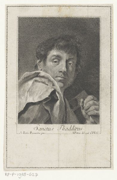 Curator: Ah, yes. Let's spend some time contemplating this striking image. This is “Apostel Judas Thaddäus”, an engraving from the late 18th century by Giovanni Marco Pitteri. What catches your eye first? Editor: Hmm, that solemn, almost burdened gaze. There's something incredibly heavy in his eyes; a sense of quiet suffering, I would even say. It gives you this really melancholic, almost meditative mood straightaway. Curator: I'd agree. Look at the composition—how the engraver plays with light and shadow, a trademark of the Baroque style, to emphasize that emotion. Notice the precise, almost mathematical rendering of the face versus the softer, blurred rendering of other sections like the clothes. The subject is in front of an almost non-descript and smoky background. All of that gives a formal balance. Editor: Absolutely, you've articulated that well. Pitteri certainly knew how to employ a structured approach, even if I don't care for rules much myself. There is something almost photographic in how shallow the depth of field feels as a result. But the details are what slay me—the subtle shading that gives him weight, a tangible presence. You can almost feel his pain, which is beautifully haunting, I think. Curator: I appreciate your perspective. What's truly interesting is how Pitteri, using the precise lines of engraving, conveys a painterly quality, emulating the emotional resonance often found in painted portraits of the era. It also manages to be historically fascinating while feeling contemporary with the subjects it captures. The material, like it is some recently found photographic plate, further highlights that tension in feeling. Editor: So, it all sort of boils down to this delicate interplay between formal technique and raw emotion, doesn’t it? It’s almost as though the engraving, usually so precise, allows for this eruption of feeling—of human fallibility to permeate the image. Curator: Precisely. I love when a work so rooted in tradition allows us to feel so connected, to remind us how vital it is to see beyond what the hand creates and towards how our eyes make us feel. Editor: So true, the formal allows emotion to surface. Thanks, that was a touching meditation.