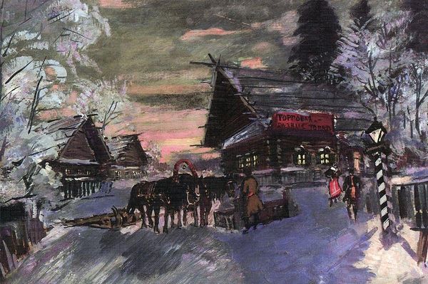 Curator: Ah, another whisper from a snowy past. Here we have "Winter Scene With Troika" attributed to Konstantin Alexeevich Korovin. Look how the muted light drapes over everything...it almost makes me shiver just looking at it. Editor: Shiver indeed. And look closely, it is more than just the atmospheric perspective that chills: note how much visible brushwork on those simple cabins evokes the raw materiality of Russian rural life and labour itself. It feels immediate, unromantic. Curator: Unromantic, maybe... or maybe real. Korovin, you see, he was painting life as it unfolded, even if a bit idealized. The troika, with its spirited horses, it just flies right at us in the center of all that muted scenery. Is it melancholic, maybe? Editor: Melancholy certainly reads through the limitations of what can be done when nature dictates that you live by a hard seasonal clock and the need to trade resources, furs, timber, labour… Observe the thick paint that hints at a utilitarian impulse to both build these modest dwellings as well as memorialize them via representation. It has very earthy texture to it! Curator: Right. And I suppose there's a longing built into that... A desire to catch these fleeting moments when labor seems in balance. It’s about the connection, though… You see those figures walking up toward the village? It is like they are threads knitting the land and its inhabitants. Editor: Threads born of necessity though, I feel compelled to mention. Consider that such painterly sketches, perhaps studies for grander commissions, also suggest a certain commodification, rendering labor and nature into portable assets...a cultural phenomenon, really. Curator: Hmmm... But what’s lovely, what sticks with me, is how these everyday things transform when viewed with even the simplest of attention and craft. Maybe that’s commodity or critique too... But the light...oh, I don't know. Thank you for the reminder that, at its essence, this scene captures our need to not just *see*, but also *value*. Editor: Agreed. There’s value found by thinking more about material means of representing subjects: the canvas itself becomes part of the historical and social narrative, offering a glimpse into labor practices, economies, and daily existence. The canvas really *holds* quite a lot here.