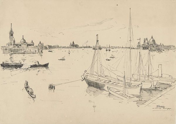 Editor: So, this graphite drawing by Carel Nicolaas Storm van 's-Gravesande, "View of Venice with a Gondola," likely created sometime between 1851 and 1924, really captures a specific mood, almost melancholic, don’t you think? The cityscape is faint, the gondola the main subject, what do you see in this piece, considering its potential symbolism? Curator: I see Venice, not just as a city, but as a symbol itself. For centuries, Venice represented a bridge between East and West, a center of trade, and a crucible of cultural exchange. Look how the artist uses the gondola. It's not merely a boat, but an emblem of Venetian identity, silently navigating the waters. Don't you feel that sense of mystery that shrouds this piece? The buildings almost fading? Editor: Yes, definitely! The way the architecture sort of dissolves into the atmosphere makes it feel like a memory, distant and perhaps idealized. Curator: Precisely! The vagueness of the buildings almost turns into a visual metaphor. A place built on water that might, at some point, return to the sea. How much do you think of Romanticism being a contributing lens for this piece, knowing how preoccupied artists were with landscape and emotion during that time? Editor: That's a great point, and considering that 's-Gravesande was a Romantic painter, maybe Venice, to him, wasn't about documentary but really more a study on mood... what feelings the image could evoke in its viewer. Curator: I agree, and through careful consideration of symbolism and its interplay with memory and emotion, the artist makes it unforgettable. Editor: I hadn’t considered Venice itself as such a potent symbol. This gives me so much more to consider! Curator: Indeed. The artist’s choice of subject offers layers of cultural meaning waiting to be discovered.