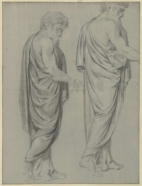 Hippolyte Flandrin created this drawing titled 'Group of Apostles' with graphite on paper. Immediately, we notice the classical robes draped around the figures, a symbol of dignity and authority, harking back to ancient Roman senatorial garb. This costuming is common among the depiction of biblical figures. One apostle places his hand on the shoulder of another in a gesture that speaks volumes. This motif of a guiding or supportive hand has ancient roots. We see it in depictions of philosophers mentoring students, and in images of emperors passing on their power. Yet, its meaning shifts subtly. Here, it suggests not just guidance but also comfort, a human connection within a divine context. Consider how this motif reappears throughout art history—Michelangelo’s God reaching out to Adam, for example. Such gestures tap into a deep, collective memory, stirring feelings of trust, support, and continuity. This isn't a linear progression, but a cyclical return, each instance layering new meaning onto the old. The emotional power of this simple yet profound gesture reminds us of the enduring human need for connection, guidance, and reassurance across time.
