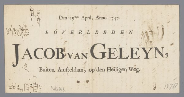 Editor: So, here we have “Overlijdensbericht betreffende Jan Yver,” which translates to "Death Notice Regarding Jan Yver." It’s a printed piece on paper, dating from after 1814. What immediately strikes me is its formal typography and somewhat melancholic air. What do you see in it? Curator: I see a powerful commentary on the nature of remembrance and social standing. Death notices like these weren't just announcements; they were carefully crafted statements about the deceased's life and legacy. Consider the choice of typeface – austere, but meticulously designed. Who was Jan Yver and why did someone commission this specific form of announcement? Editor: The text indicates he was a "Makelaar," a broker, and it lists his address. Does this give you a sense of his position within Amsterdam society? Curator: Precisely. The inclusion of his profession and address places him within a specific socio-economic context. The choice to print this notice suggests a certain level of respectability. It asks us to consider: who gets remembered, and how? Were these announcements common, or a sign of wealth and influence? How might the recipients have reacted to seeing this particular notice displayed or circulated? The date itself, shortly after the Napoleonic era, invites questions about social and political shifts and how they affected individual lives. Editor: It’s amazing how much historical and cultural information is embedded in such a seemingly simple object! Curator: Indeed! By looking beyond the surface, this print invites us to consider larger questions about social structures, historical narratives, and the very act of remembering. What was life actually like in Amsterdam at this time for Jan Yver? Editor: It's fascinating to consider art's ability to carry all this complex information. It gives a whole new perspective on something as straightforward as an announcement. Curator: It really makes you wonder who the 'anonymous' artist or printmaker was.