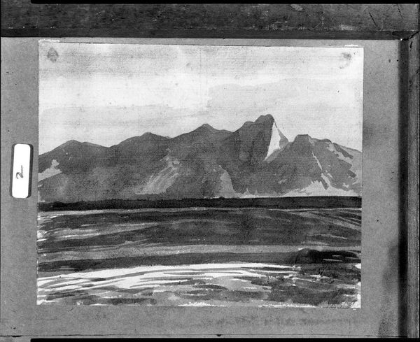 Curator: Here we have Martin Mower's "Looking West from Kicking Horse Lake," a landscape rendered in monochrome wash. Editor: My first impression is the stark contrast between the textured foreground and the distant mountains. It feels monumental yet subdued. Curator: The artist's use of wash skillfully models the forms, creating a sense of depth and atmospheric perspective. The interplay of light and shadow is quite effective, wouldn't you agree? Editor: Absolutely, and I'm curious about the paper choice. It looks like a coarse laid paper, likely chosen to enhance the tactile quality of the wash and evoke the ruggedness of the landscape itself. Curator: An insightful point. It's the skillful manipulation of tone and form that truly resonates with me. Editor: I find myself considering the physical act of creating such detail by hand, in a time far removed from digital imaging. A lot of labor went into this. Curator: It certainly lends a unique resonance, doesn't it? Editor: Indeed. The intersection of process and representation is really compelling.
