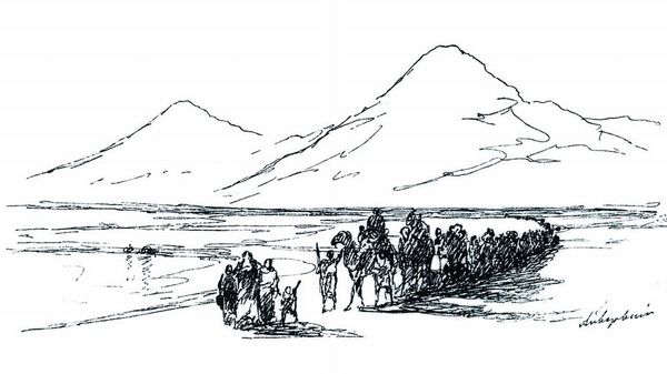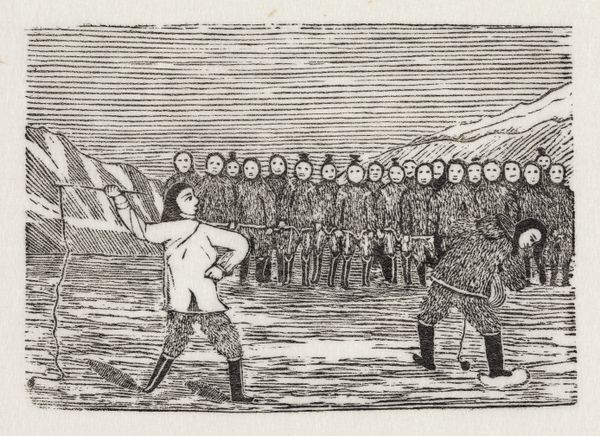 This small woodcut print, titled “The Tale of Ungilatake,” was created by Markus Lynge, an artist born in Greenland in 1816. Lynge’s images offer a window into 19th-century Greenlandic life, at a time when the indigenous culture was under pressure from Danish colonization. Here we see Ungilatake, a legendary Greenlander, celebrated for his strength and hunting prowess. The print depicts Ungilatake feeding a polar bear and another animal he has single-handedly captured. Lynge's work exists in a tension, embodying both the traditional Inuit way of life and the influence of European artistic styles and colonial presence. Consider how the community gazes upon Ungilatake. Are they admiring his strength, or is there a sense of concern about the changing world around them? Lynge's narrative resonates even now, prompting us to reflect on the legacy of colonialism and the resilience of indigenous cultures in the face of cultural change.
