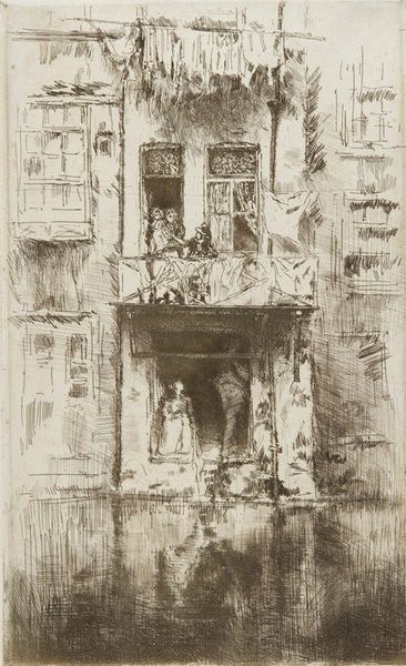 James Abbott McNeill Whistler created this watercolor painting, titled "The Balcony," using pigments suspended in water, applied to paper. The choice of watercolor lends itself to capturing fleeting moments and subtle atmospheric effects, seen here in the soft washes and delicate gradations of tone. But let's consider the social implications of this scene. Whistler often depicted scenes of everyday life, choosing subjects that reflected the changing urban landscape and the lives of ordinary people. Note that the artist's application of the watercolor is suggestive of labor; the rapid, fluid strokes indicating the artist's deft handling of the medium, but also a kind of casualness that was read as modern in its day. By focusing on the materiality and making of "The Balcony," we can appreciate how Whistler challenged traditional notions of fine art and craft, elevating the humble medium of watercolor to new expressive heights.