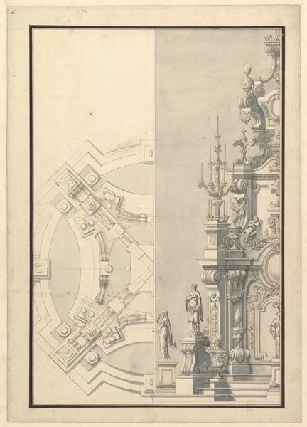 Giuseppe Galli Bibiena made this drawing of pen and brown ink with gray wash, over black chalk, on cream laid paper. This highly detailed drawing offers a glimpse into the elaborate rituals surrounding death and power in 18th century Europe. Bibiena, an Italian designer working in the Habsburg court in Vienna, specialized in theatrical designs and ephemeral decorations. This drawing shows us half of the plan and half of the elevation of a catafalque, a temporary structure erected to honor a deceased member of the royal family. The catafalque, with its elaborate sculptures and imposing scale, was designed to inspire awe and reinforce the power of the monarchy. Through visual codes such as classical architectural motifs and symbolic ornamentation, Bibiena evokes a sense of timeless authority. By studying the cultural context of such designs, along with court records of the funerals and other archival material, we can understand the public role of art in shaping perceptions of power.