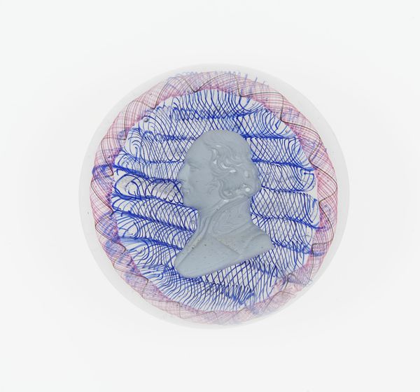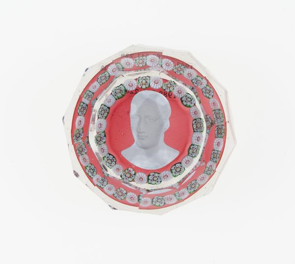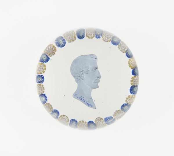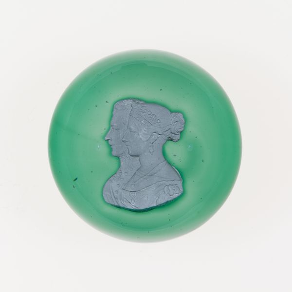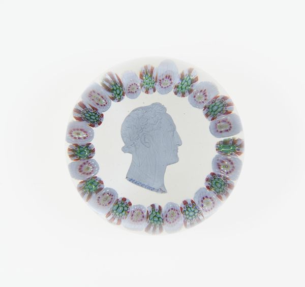 This paperweight was made at the Clichy Glasshouse in France sometime between 1837 and 1885, encapsulating a cameo-like portrait in clear crystal glass. The process involved highly skilled glassmakers, who were masters of controlling molten material. It’s likely that the portrait itself was prefabricated, perhaps in ceramic, and then carefully positioned before the glass was cast around it. The clear glass acts like a lens, magnifying the portrait within. This was an elaborate, multi-stage process, requiring a division of labor. Paperweights such as these were luxury goods, meant to convey refinement, and were sought-after objects for the burgeoning middle class. Though small in scale, this object embodies both artistic skill and industrial production. It collapses the distinction between craft and design, and reflects the changing social landscape of 19th-century Europe.