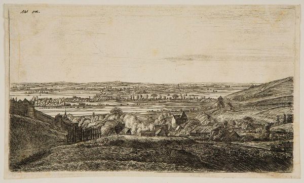 Editor: This is "Gezicht op ruïnes van Bramber Castle," or "View of the Ruins of Bramber Castle," by Wenceslaus Hollar, made sometime between 1625 and 1677. It's a drawing, very delicate and quite small. I find the depiction of the ruins, softened by time and nature, evokes a feeling of melancholy, but also perhaps resilience. What stands out to you when you look at this piece? Curator: It's fascinating to consider Hollar's depiction of Bramber Castle as more than just a landscape. Think about what ruins signify. They are not merely the absence of what was, but a potent symbol of time’s relentless march, and often, of power structures that have crumbled. Given the turbulent 17th century context in which Hollar worked, particularly the English Civil War, do you think these ruins might represent a commentary on political instability, on the ephemeral nature of authority and the impact on social mobility? Editor: That's a really interesting angle I hadn't considered! So, beyond the literal depiction of ruins, it becomes a kind of visual metaphor? Curator: Exactly. Hollar, who experienced exile himself during the Civil War, was acutely aware of displacement and loss. The meticulous detail in capturing the crumbling castle, juxtaposed against the vast, indifferent landscape, brings those feelings of precarity into focus. What effect do you think his choice to depict it as a drawing has on the viewer? Editor: The fragility of the medium reinforces the subject. It is easy to identify his mental state regarding his contemporary political turmoil. It makes the ruin seem more vulnerable somehow. This drawing offers a new perspective. I'd never considered art could be so intricately linked to the personal and political context of its creation. Curator: It reveals how deeply intertwined art and life are, doesn't it? And how the debris of the past continues to speak volumes about our present.