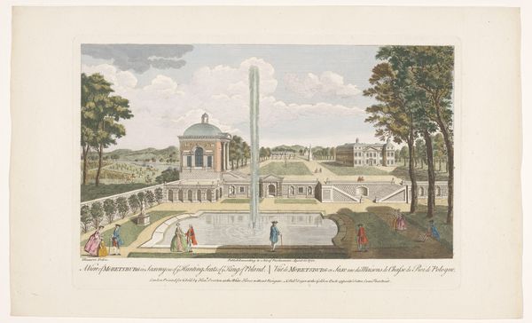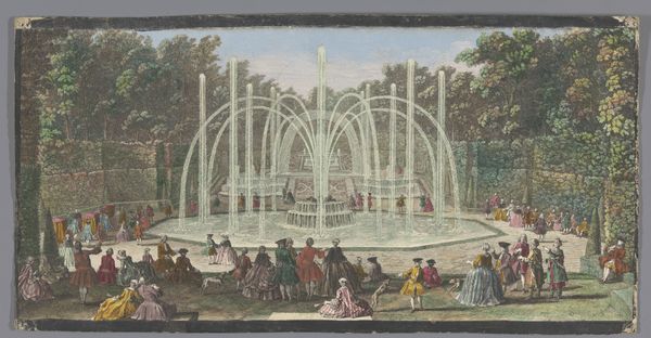 Curator: At first glance, I'm struck by the opulence and almost theatrical quality of this scene. It’s quite a production. Editor: It truly is. This is Jacques Rigaud's "Gezicht op het Bosquet des Dômes in de Tuin van Versailles," made sometime after 1691. Rigaud captured it using watercolors, colored pencils, en plein air, as was his method, resulting in a remarkable landscape drawing of the estate. What do you make of Rigaud's chosen mediums and technique here? Curator: Well, the watercolor application feels intentional—the artist is choosing to give it an ephemeral or dreamlike feel; these materials really speak to that sort of atmospheric quality of the scene itself, right? I'm wondering about how he managed to depict this level of architectural detail outdoors, which seems to contrast this material delicacy. What do we know about Rigaud himself? Editor: Rigaud, coming from a family deeply involved in drawing and printmaking, made a name documenting royal properties, so we're seeing the machinery of image-making and power all bound up together here. I can't help but consider Versailles' symbolism here: how does it function as a representation of both Louis XIV’s absolute authority and the profound social stratification of the era? Curator: Precisely. The very act of commissioning such elaborate drawings like these speaks volumes about the King’s desire to display absolute command of land and resources, including the artists creating these drawings! Editor: The people almost become part of the ornamentation, mere spectators in this display of power and artifice. Do you find anything interesting about the labor required to realize and maintain such art, not only the artwork but also the gardens themselves? Curator: Absolutely, we’re considering everything: the physical act of landscaping, sourcing, irrigation, but also this social aspect – the spectacle of wealth! The drawing captures labor that is often invisibilized: both of garden staff and the artist that needs patronage in order to survive. Editor: By positioning art making as labor and thinking about the social life that is present in Rigaud's choice of making this 'view,' we’re not only reflecting on the world as Rigaud presents it but also on the conditions that render such a vision possible. Curator: And perhaps in considering that, we come to terms with both Rigaud's material choices and our own positions as viewers engaging with history.