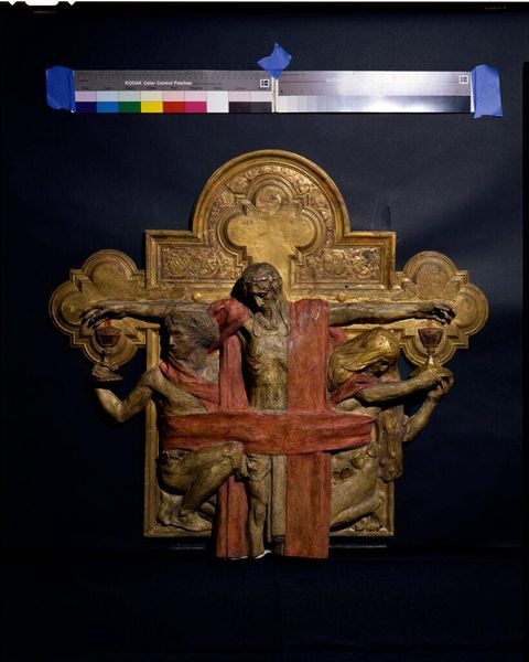 Curator: What a remarkably sturdy piece. Its form is so grounded, almost like an architectural plan rendered in miniature. Editor: Indeed. It’s compelling to consider the context of this piece. The "Crucifix of Princess Gunhilde," made by an unidentified artist, speaks volumes about religious devotion, royal power, and perhaps, the very identity of the princess herself. Curator: Note the precise carving of figures and text. Semiotically, each choice serves to reinforce the overall message. Editor: And who was Princess Gunhilde? Her narrative is now enmeshed with this object, but also likely shaped by patriarchal religious structures. Curator: I find the symmetrical composition particularly effective. It lends a sense of balance, order, and eternal significance. Editor: The cross is more than its shape; it embodies layered meanings about faith, gender, and the lasting impact of historical figures. Curator: A testament to the enduring power of symbolic form. Editor: It inspires us to think critically about the narratives art carries through time.