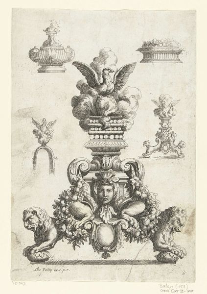 Editor: So, here we have "Kan, het oor is aan de bovenzijde bevestigd aan de rug van een vrouw", or "Jug, the ear is attached to the back of a woman", created in 1548 by Balthazar van den Bos. It's an engraving, giving it a really intricate and almost fantastical feel. The jug itself is so ornate, it's almost overwhelming. What do you make of this piece? Curator: Ah, yes, a veritable cornucopia of…stuff, isn’t it? When I look at this, I think about the Renaissance obsession with classical antiquity. See how van den Bos is riffing on ancient Roman designs? All these figures – are they gods, heroes, cheeky cherubs? And consider that O-shaped handle... Is that an O? An ear? Does it make you want to hold this impossible object, lift it, and drink from it? I think that's the point. Editor: It does feel like a fever dream of a fancy object! It seems too cluttered to be functional. Curator: Exactly! Functionality takes a backseat here. Think of it as a demonstration of artistic virtuosity, of technical skill. And remember, engravings like these were often created to be copied and adapted by artisans. It's like a design catalogue, spreading new styles and ideas. So, how does knowing that change your impression? Editor: It makes sense! So it's less about this specific jug and more about the ideas it represents and spreads? I guess it's like an ancient Pinterest board! Curator: You've nailed it! It's a conduit of inspiration, dressed up in mythological drag. See, you are on your way.