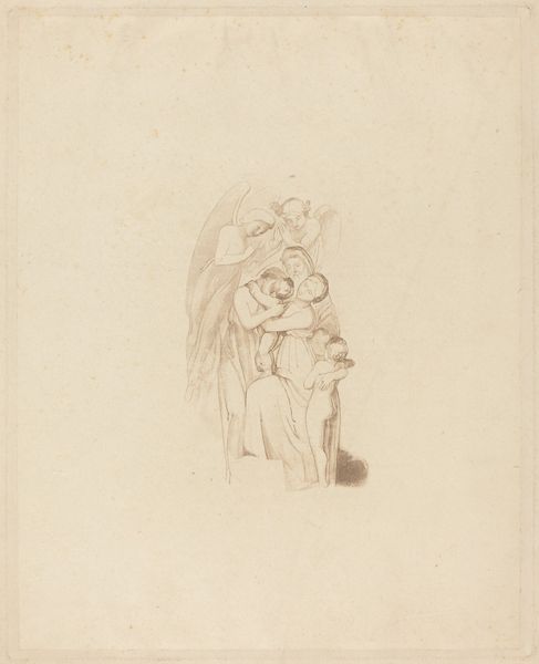 This etching, "Mother and Child Seated in a Landscape," was created by Louis Gallait, a Belgian artist active in the 19th century. The method is significant: etching, an intaglio printmaking technique, involves using acid to cut into a metal plate, which is then inked and printed. The image’s delicate lines and subtle gradations of tone are achieved through careful manipulation of the etching process, demonstrating skilled control over the medium. The relatively small scale of the print also speaks to the intimacy of the subject matter. Consider the broader context: during the 19th century, printmaking played a crucial role in disseminating images and ideas to a wider audience. The labor-intensive nature of etching contrasts with the rise of industrial printing methods, highlighting a tension between handcrafted artistry and mass production. By appreciating the material processes involved, we can fully understand the artwork's meaning and its place within the broader social and cultural landscape.