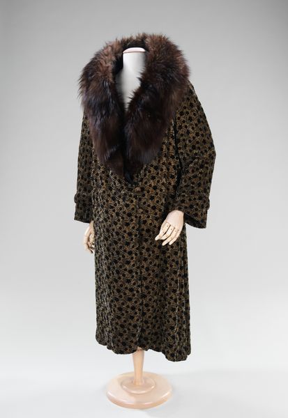 Curator: Here we have an evening coat designed by the House of Worth in 1901. The coat is now part of the collection at the Metropolitan Museum of Art. Editor: Oh, wow! That's quite a statement piece. I immediately imagine a glamorous woman gliding through a dimly lit ballroom, maybe plotting something deliciously scandalous. The fur trim really amplifies that sense of decadent drama, doesn't it? Curator: Indeed. Worth was known for their luxurious materials and elaborate designs, and this coat exemplifies that. You have the deep pile of the velvet contrasted with the lushness of the fur. Also note the appliqué decoration using lighter shades of green which break up the deep, dark swathes of color across the material, and those dangling beaded embellishments add movement and catch the light. Editor: It feels a little heavy, visually, though. All that dark velvet and fur. I wonder if it felt as heavy to wear. It’s the kind of thing that probably came with its own specific set of social expectations, right? The wearer would need to match the extravagance. Curator: Precisely. It speaks volumes about the wearer's social standing and their engagement with contemporary fashion. Worth's clientele were, shall we say, people of means. We should consider the economic context, the social implications of wearing such an item. Editor: You know, even the color palette feels intentional. That rich, dark green almost absorbs the light, creating an aura of mystery. It's the kind of coat a sorceress would wear! Curator: (Chuckles) An interesting point. The House of Worth was not simply making clothes; they were crafting entire images. Consider the craftsmanship that went into this garment, the labor of the artisans involved in its production. Editor: It’s so tempting to reach out and feel it—the velvet, the fur...imagine the stories those fabrics could tell. The hushed conversations, the stolen glances, the secret rendezvous…! I picture it sweeping across marble floors… Curator: Well, its craftsmanship definitely insured it was fit for such purposes. Reflect on how the art object is embedded within a complex web of social relations, how clothing serves as a marker of identity and status. Editor: You're right. Beyond the glamour, there’s so much to unpack about societal roles and craftsmanship in one single garment. What an invitation! Curator: Indeed. I think our brief look there really allows for some deep reflections to take place.