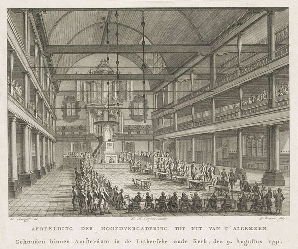 Editor: Here we have Caspar Jacobsz. Philips’ "Interior of the Old Lutheran Church in Amsterdam," made in 1769. The engraving creates a strong sense of depth, and the architecture feels monumental. What can you tell me about it? Curator: Beyond its technical skill, this print speaks volumes about religious tolerance and the social fabric of 18th-century Amsterdam. Consider the Lutheran church, a space for a minority religion, rendered with such detail and grandeur. It prompts us to ask, whose stories are usually left out of historical narratives? How does the depiction of space shape our understanding of power dynamics within a community? Editor: So the very existence of this detailed print challenges a simplified narrative? Curator: Precisely. The inclusion of everyday figures also humanizes the scene, showing the intersection of the sacred and the mundane. It urges us to think about who occupied and experienced this space, and what their lives were like. Where might gender, class, or even race intersect with religious identity within this image? Editor: I see what you mean. Focusing on whose stories are visible, and whose aren't, gives a whole new dimension to understanding the print. Curator: Absolutely, it becomes a conversation about representation, power, and the often-silenced voices within history. It encourages us to bring an intersectional lens to art history. Editor: That’s a perspective I’ll definitely take with me. Thanks! Curator: My pleasure. Remember art is never created in a vacuum, and thinking about the forces shaping the work always enriches our understanding.