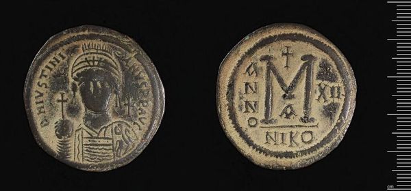 Editor: Here we have a Large Follis of Anastasios I from Constantinople. It’s quite small, but the details are impressive. What do you make of it? Curator: It’s a powerful object. Coinage like this served as a form of propaganda. Consider how the image of Anastasios I, even in miniature, projects authority. Editor: Propaganda? How so? Curator: The emperor's image, circulated widely, visually reinforced his power and legitimacy. The coin itself became a symbol of the state's reach and economic stability. Does that change how you see its role? Editor: I hadn't thought about the visual impact beyond its face value. This has given me a whole new perspective. Curator: Precisely! That's the beauty of studying art in its historical context.