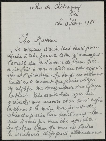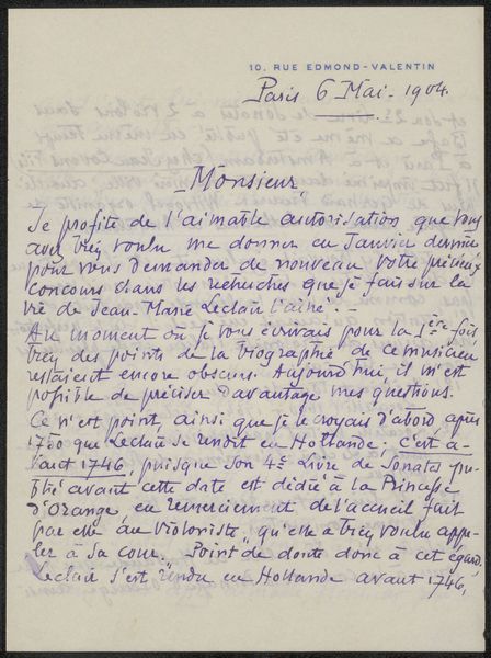 Editor: This is a letter titled "Brief aan Philip Zilcken," possibly from 1904, by Lionel de la Laurencie. It seems to be created with a mix of ink, pen, and maybe printed elements on paper. There's a handwritten quality to the French text that feels intimate, even though it is addressed formally to "Monsieur". I'm struck by how ordinary it appears – a simple letter, but what stories might it tell? How do you interpret its significance as a historical document? Curator: Precisely! It's tempting to dismiss something like this as ephemera, but consider its potential. This isn’t just a private correspondence, but a potential glimpse into the art world of the early 20th century. Zilcken was a known artist and art critic, wasn’t he? So, who was de la Laurencie, and what was their relationship? The content might illuminate aspects of artistic circles, patronage, or even the art market at the time. We can learn so much about social and professional networks by analyzing letters such as this, like uncovering evidence about who supported whom. Editor: Ah, so you see the recipient as a key to unlocking its historical meaning. I hadn’t considered Zilcken's position as an entry point. The reference to the artist possibly passing “unaperçus dans…", nearly unnoticed suggests commentary on the recognition, or lack thereof, afforded to artists at the time. Is that a plausible reading? Curator: Indeed, or perhaps about the changing tastes of the art market, or a very personal assessment of someone's creative production. Such insights are vital for understanding how artistic reputations are constructed and sustained, or lost to the sands of time. Remember that institutions and cultural gatekeepers heavily shape what becomes visible and valuable. And also…think about its potential public role now. How can this simple correspondence challenge current institutional frameworks? Editor: That is thought provoking. Looking at art in context gives it new value. I initially saw this letter as simply correspondence, but with context, it's a rich artifact about networks and critical assessment! Curator: Exactly. Every element of its visual design is a considered argument to something that preceded it, and points to everything that would follow.