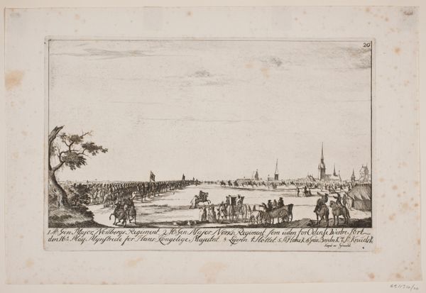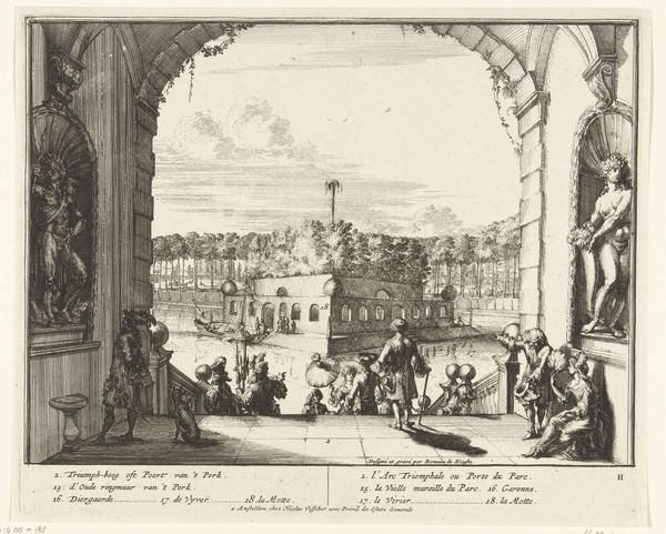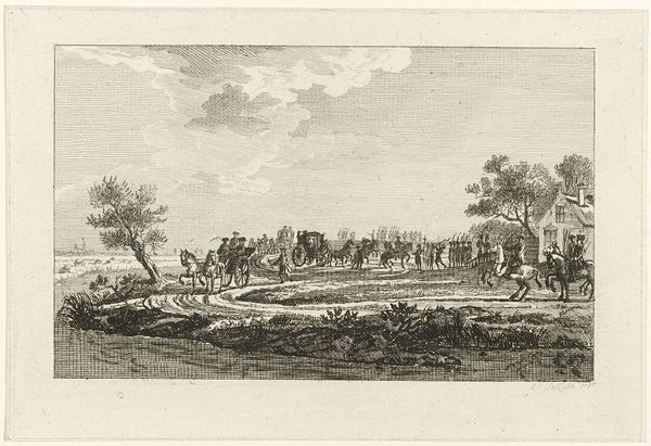 Editor: This is Jean-Michel Moreau's "The Place de la Concorde." I'm struck by the detail he achieves in such a small space. What can you tell me about the history of this place and its representation? Curator: This print captures the Place de la Concorde, a site laden with political significance. Originally named Place Louis XV, it became a stage for revolution, including Louis XVI's execution. How do you think Moreau, working later, engages with that fraught history? Editor: Perhaps by showing it as orderly, a space of leisure rather than revolution? A way of re-writing the narrative? Curator: Precisely. Moreau's print offers a vision of restored order, subtly reinforcing the power structures of the time. It's a fascinating example of how art can shape public memory.