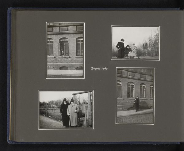 Editor: This is "Lente in Wenen," or "Spring in Vienna," by Berti Hoppe, taken sometime between 1930 and 1931. It looks like an album page with multiple black and white photographs affixed to it, each a scene from Vienna. The mood feels…nostalgic, maybe a little melancholic. What do you see in this piece? Curator: I see a fascinating intersection of personal narrative and urban history. These aren't just pictures of Vienna; they're curated memories presented in the format of an intimate album, meant to capture, preserve and project individual experience. Hoppe’s arrangement asks us to consider whose perspective is being privileged here. Do these images disrupt dominant historical narratives by showcasing a woman's experience of urban space during a tumultuous period? Editor: That's an interesting point. I hadn’t thought about whose experience it was showing. How would you relate that to the photographs? Curator: The images themselves are telling. Consider the shot of the woman walking on the path. Is she a participant in or an observer of the scene? Hoppe seems conscious of placing figures in relation to architectural and natural settings to subtly comment on individual experiences within society. This act of selecting and arranging challenges traditional depictions of Vienna by incorporating her lived reality as a woman in 1930s Europe. Do you think that changes how we understand the imagery? Editor: Definitely. Thinking about the context and perspective gives a new layer to the photos. Instead of just seeing pretty pictures, I'm now wondering about the photographer's point of view, her experiences, and what she wanted to say about the world around her. Curator: Exactly. The placement of photos like dried botanicals, like pressed flowers, further sentimentalizes each photograph and marks this specific historical experience with a deeply affective and personal tone. So next time you view an image, think critically: who created it, under what conditions, and whose stories are being told? Editor: This has totally changed how I'll look at photographs going forward. Thanks so much!
