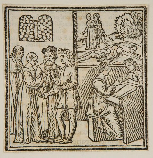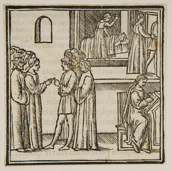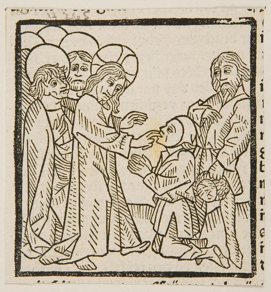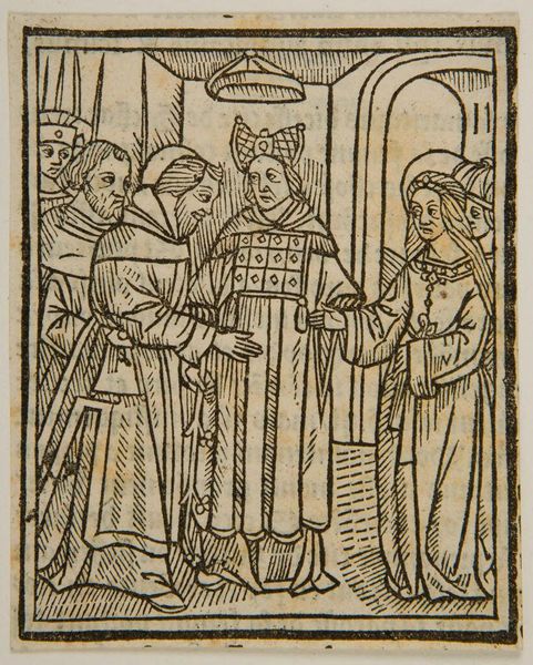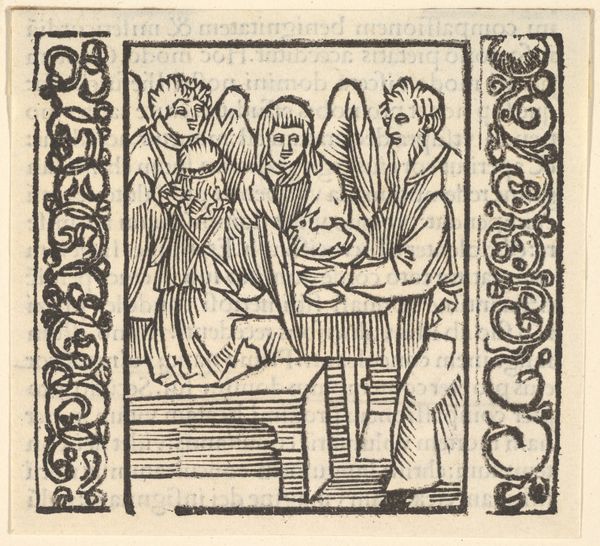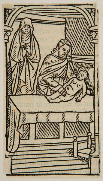 Editor: This anonymous woodcut depicts the Presentation of Christ in the Temple. It has a very simple, almost austere quality. What stands out to you? Curator: Notice how the artist uses linear patterns. These aren’t just decorative; they’re symbolic. The repeated lines create a sense of visual rhythm, evoking the ritualistic nature of the Presentation. Does that resonate with you? Editor: Absolutely. It does feel very formal and symbolic. The halos, for instance. Curator: Exactly. The halos are visual cues. They immediately communicate holiness and divinity, key to understanding the scene's cultural significance. And the child’s placement...what does that suggest to you? Editor: That he’s the center of attention, obviously, but also vulnerable, I guess? Curator: Precisely. The vulnerability highlights the promise and the prophecy surrounding him. It is a powerful visual statement. Editor: I see it now. The symbols carry so much meaning. Curator: They do, and understanding them enriches our appreciation of the artwork and its historical context.