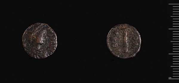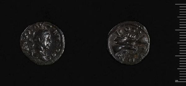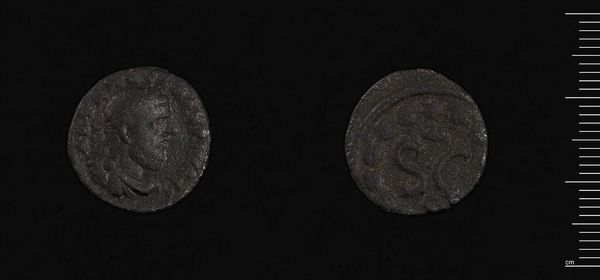 Curator: Here we have a coin from Antioch under Macrinus, a small but powerful piece currently residing in the Harvard Art Museums. Editor: It looks so unassuming, almost like something you'd find buried in your garden. But it carries so much history! Curator: Precisely. The craftsmanship itself is remarkable, considering its age and size. Notice the details in Macrinus' profile on one side, and the intricate serpent design on the other. Editor: That serpent! It coils so elegantly, almost like it's whispering secrets from the past. It makes me wonder about the stories it could tell. Curator: The serpent was a symbol of Asclepius, the Greco-Roman god of medicine, which underscores the city's concern for health and well-being. Editor: It's amazing how much meaning can be packed into such a small object. It really is an access point for the concerns and artistry of a whole empire.
